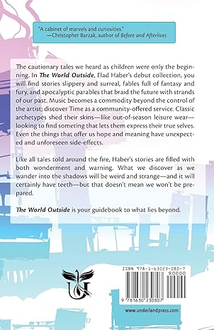 The cautionary tales we heard as children were only the beginning. In The World Outside, Elad Haber’s debut collection, you will find stories slippery and surreal, fables full of fantasy and fury, and apocalyptic parables that braid the future with strands of our past. Music becomes a commodity beyond the control of the artist; discover Time as a community-offered service. Classic archetypes shed their skins—like out-of-season leisure wear— looking to find something that lets them express their true selves. Even the things that offer us hope and meaning have unexpected and unforeseen side-effects.